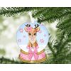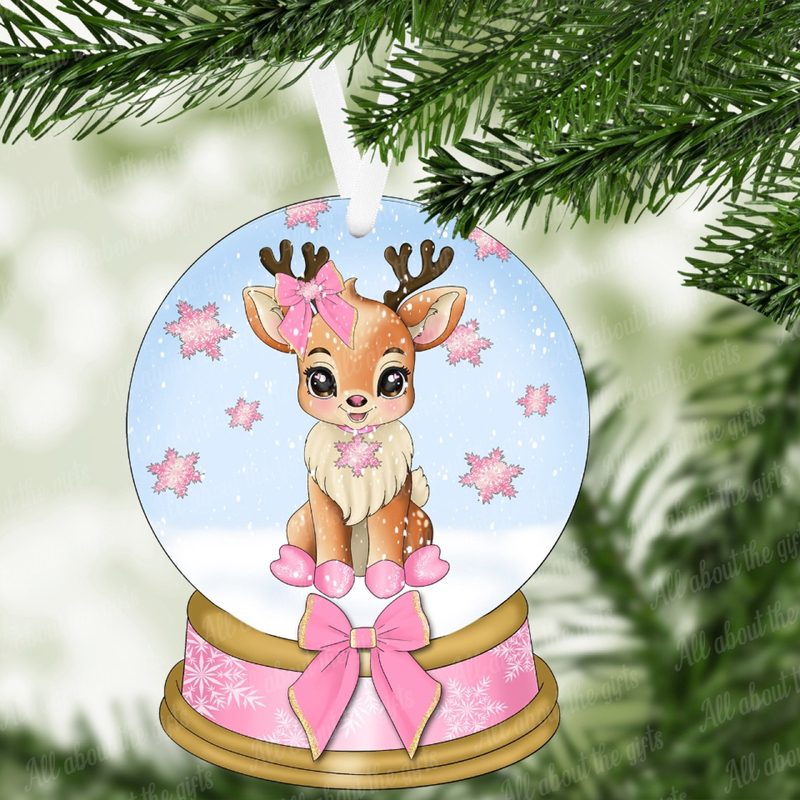 Inside the globe, Donna – a cute reindeer with a pink bow, glittering snowflake pendant, and matching pink boots – sits gracefully in a gentle snowfall. Pink snowflakes swirl around her, set against a soft snowy background, creating a whimsical winter scene with a feminine twist.