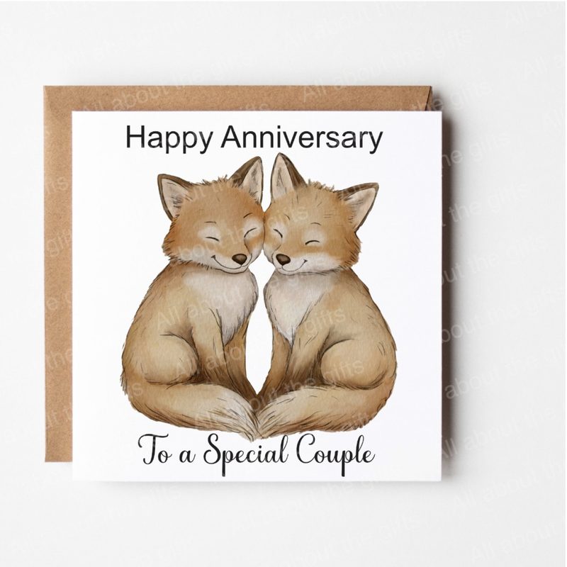 A sweet and thoughtful anniversary card featuring two adorable foxes sitting together with their tails forming a heart shape. This charming design makes a lovely way to celebrate a special couple and their anniversary.