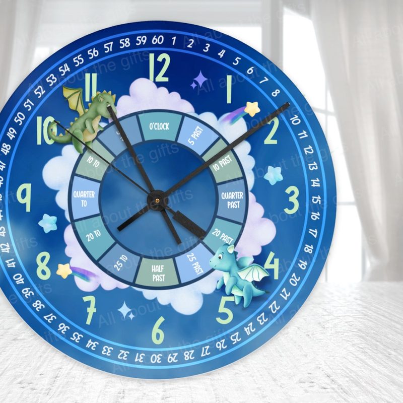 Bring a little magic to time-telling with this Magical Dragon Learning Clock, a beautifully designed glass wall clock that’s as educational as it is enchanting. Featuring friendly dragons, soft clouds, and shooting stars on a calming blue background, this clock is perfect for children’s bedrooms, playrooms, nurseries, or classrooms.