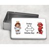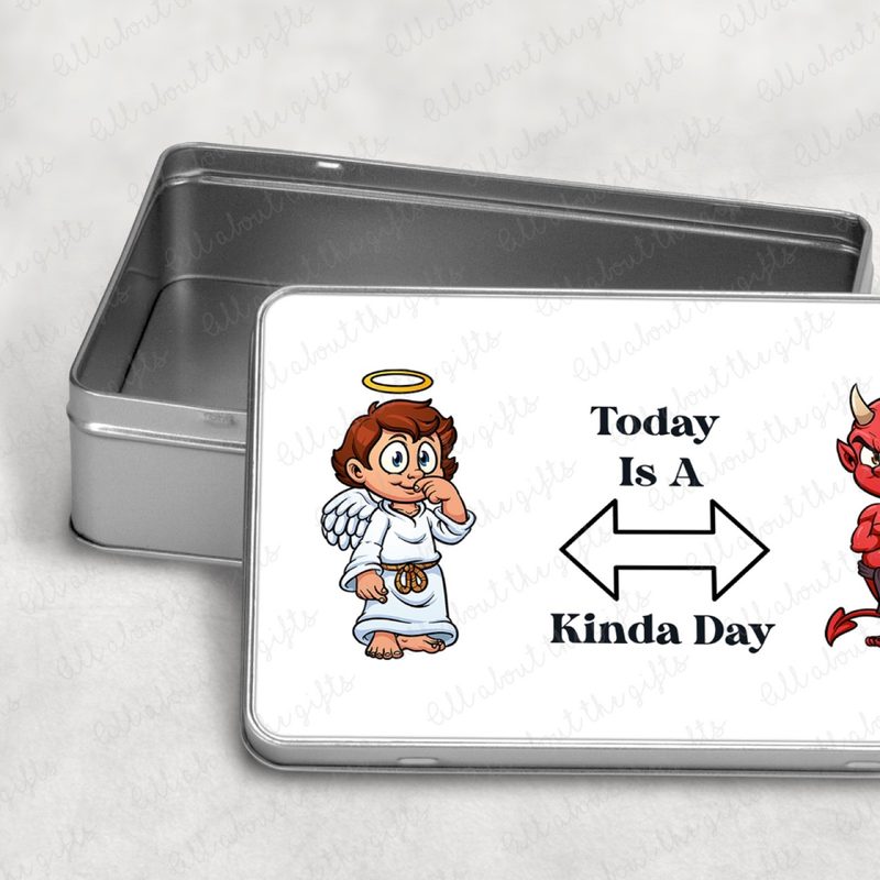 Capture a playful mix of mischief and virtue with this Personalised Angel & Devil Storage Tin. Featuring an angel on one side, a devil on the other, with a double-ended arrow between them and the wording “Today is a ....Kinda day”, this tin is perfect for keeping small items organised with a sense of humour. Measuring 18.4cm (W) x 5.5cm (H) x 11.4cm (D), it’s ideal for storing stationery, trinkets, snacks, or keepsakes. a unique, cheeky gift for friends, teens, or anyone who enjoys playful designs.