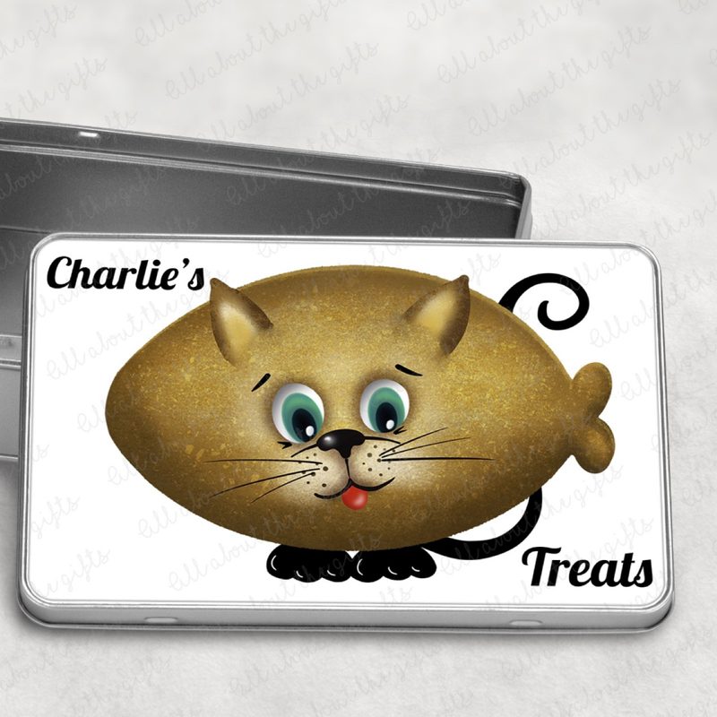 Treat your feline friend in style with this Personalised Cat Treat Tin. Featuring a playful biscuit-shaped fish design with a cute cat’s face inside, this tin is the purr-fect way to keep treats fresh and close to paw. Measuring 18.4cm (W) x 5.5cm (H) x 11.4cm (D), it’s just the right size for storing cat treats, biscuits, or small toys. Add your cat’s name or a special message to make it a truly unique storage tin—ideal for gifting pet owners or spoiling your own furry companion.