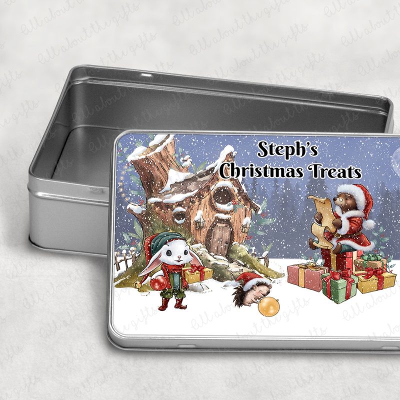 Bring festive cheer to your storage with this Personalised Christmas Storage Tin. Featuring an adorable bear dressed in a Santa costume, sitting atop a pile of presents and reading the Nice List, while woodland friends play joyfully around him, this tin is full of holiday charm. Measuring 18.4cm (W) x 5.5cm (H) x 11.4cm (D), it’s the perfect size for holding sweets, Christmas treats, trinkets, or small keepsakes. Personalise with a name or message to create a magical keepsake gift that will be treasured year after year.