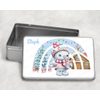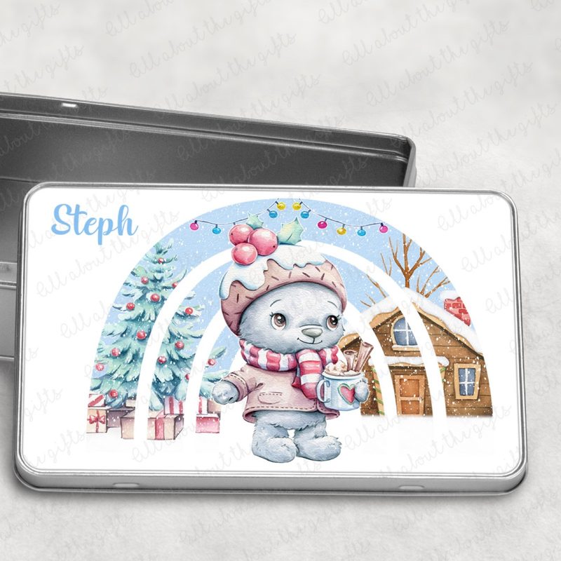 Celebrate the season with this charming personalised tin (18.4 x 11.4 x 5.5 cm), featuring a festive Christmas triple arc design, like a rainbow. The scene shows a cosy log cabin and Christmas tree, framed by the glowing arcs. Adding a touch of warmth, a delightful bear in a pink jacket and matching hat decorated with mistletoe enjoys a steaming cup of hot chocolate. A heartwarming and practical keepsake box, this tin makes a perfect Christmas gift or seasonal storage solution.