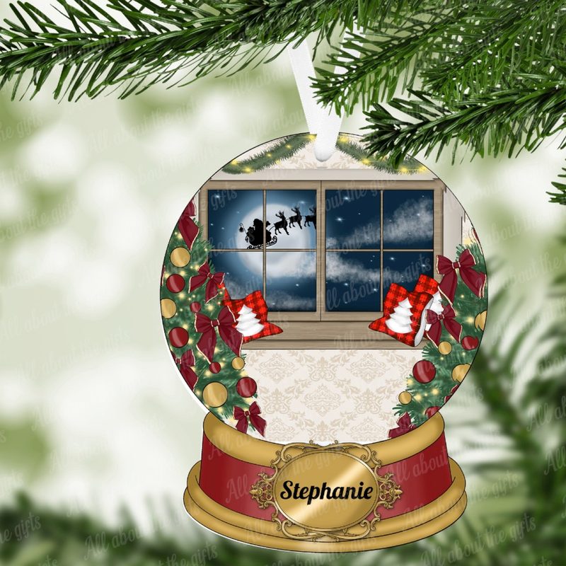 Inside the snow globe, the room is adorned with rich garlands, ornaments, and red plaid stockings hung beneath the window. Through the frosty glass, you can see Santa in silhouette soaring through the moonlit sky. The base of the ornament is styled in deep red and gold and features a gold-framed nameplate that can be personalised with any name of your choice (e.g. Stephanie, James, Mum, etc.).
