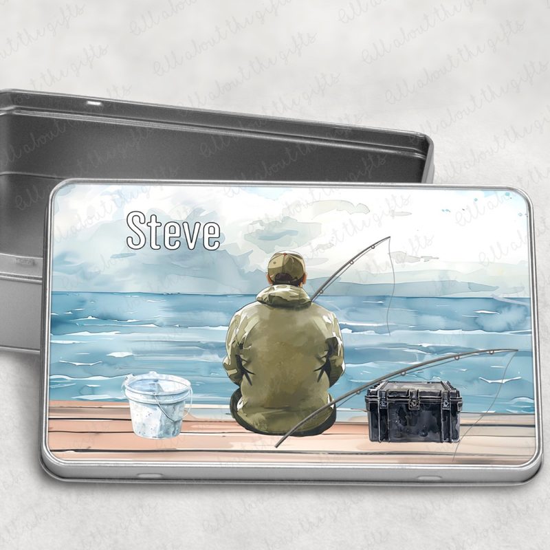 Capture the calm of a day by the water with this Personalised Fisherman Storage Tin. Featuring a fisherman sitting on a wooden pier, fishing line cast into the sea, tackle box on his right, and catch bucket on his left, this tin brings a serene fishing scene to life. Available with hair colour variations, it’s a thoughtful way to match the character to your gift recipient. Measuring 18.4cm (W) x 5.5cm (H) x 11.4cm (D), it’s perfect for storing small keepsakes, fishing accessories, or snacks. Personalise with a name or message to create a unique gift for fishing enthusiasts, birthdays, or special occasions.