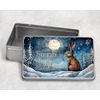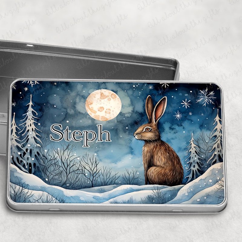 Bring the magic of the night to your storage with this Personalised Hare Storage Tin. Featuring a winter night scene with three variations: a hare gazing at the moon, a hare without the moon, and two hares looking at each other, this tin captures peaceful woodland charm. Measuring 18.4cm (W) x 5.5cm (H) x 11.4cm (D), it’s perfect for storing keepsakes, small trinkets, or treats. Personalise with a name or message to create a unique gift for animal lovers, nature enthusiasts, or anyone who enjoys whimsical woodland scenes.