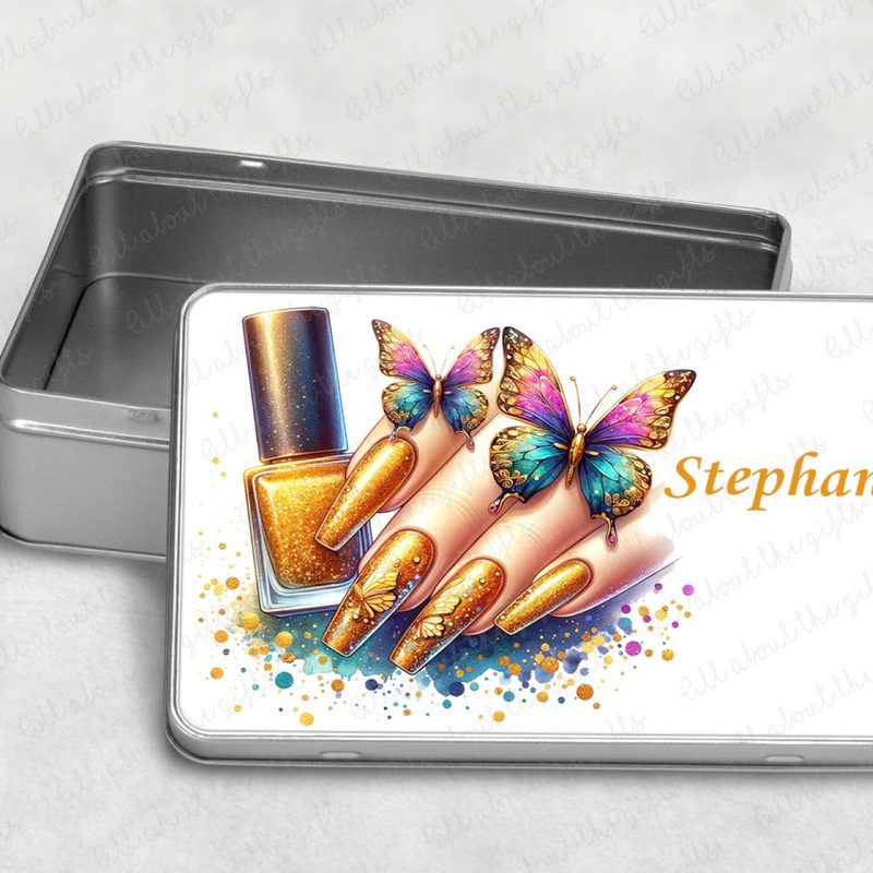 Add a touch of glamour to your storage with this Personalised Nail Art Storage Tin. Featuring an elegant design of fingers with long polished nails, a nail varnish bottle, and delicate butterflies resting on the fingers, this tin is perfect for beauty lovers. Measuring 18.4cm (W) x 5.5cm (H) x 11.4cm (D), it’s ideal for storing nail varnishes, manicure tools, accessories, or keepsakes. Personalise with a name or special message to create a stylish, unique gift—perfect for birthdays, pamper hampers, or anyone who loves nail art and beauty.