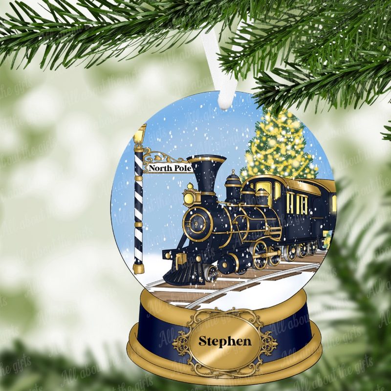 Crafted from high-quality MDF and measuring 100mm x 78mm, it comes in a choice of gloss or glitter finish and includes a pre-drilled hole and ribbon, ready for hanging. Inside the snow globe, the scene captures a classic black and gold steam train set against gently falling snow, a golden-lit Christmas tree, and a decorative North Pole sign.