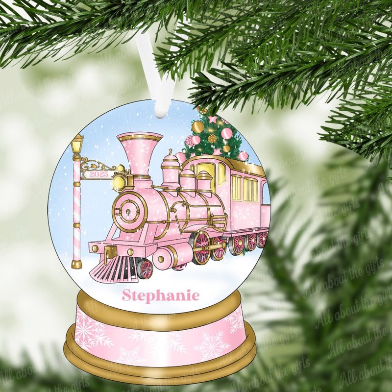 Pink Christmas Express Snow Globe Ornament – 100mm x 78mm MDF (Gloss or Glitter Finish)
