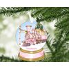The train is set against a snowy background, complete with a lavishly decorated Christmas tree filled with pastel ornaments. The snowy setting, elegant gold accents, and soft candy pink tones make this ornament an eye-catching addition to any Christmas tree.