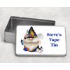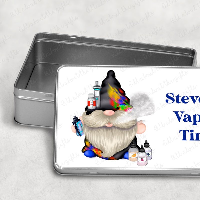 Keep your vaping essentials organised with this Personalised Vape Storage Tin. Featuring a male gnome blowing out vape clouds, holding a vape device in his hand, with a vape device and e-liquid bottle tucked into his hat, this tin is both fun and functional. Measuring 18.4cm (W) x 5.5cm (H) x 11.4cm (D), it’s perfect for storing vape devices, e-liquids, or small accessories. Personalise with a name or message to create a unique gift for vaping enthusiasts, birthdays, or special occasions.