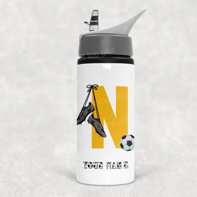 Stay hydrated in style with this personalised football alphabet water bottle, featuring a bold initial design with football boots and ball detail. Perfect for football fans of all ages, this bottle makes a practical and thoughtful gift for school, sports, or everyday use.