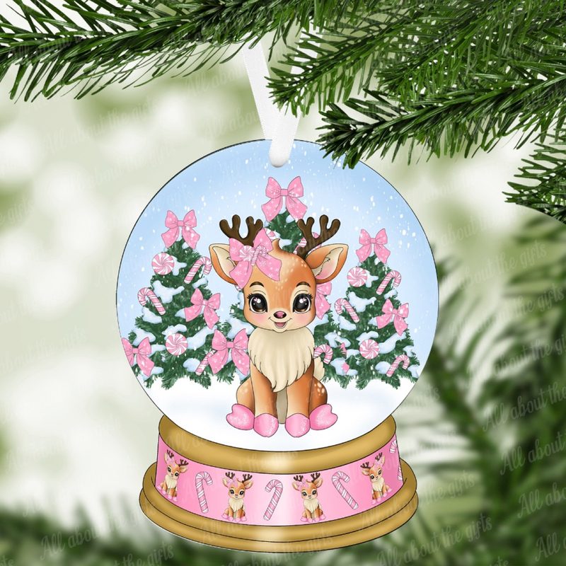 Add a dash of cuteness and candy-striped cheer to your Christmas décor with this adorable Vixen Snow Globe Ornament! Featuring a darling baby reindeer named Vixen, this design is bursting with pastel charm — from her pink boots and oversized bow to the festive candy-themed forest behind her.