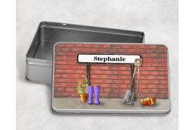 Personalised Garden Storage Tin – Brick Wall & Wellies Scene | Keepsake Box £12.50